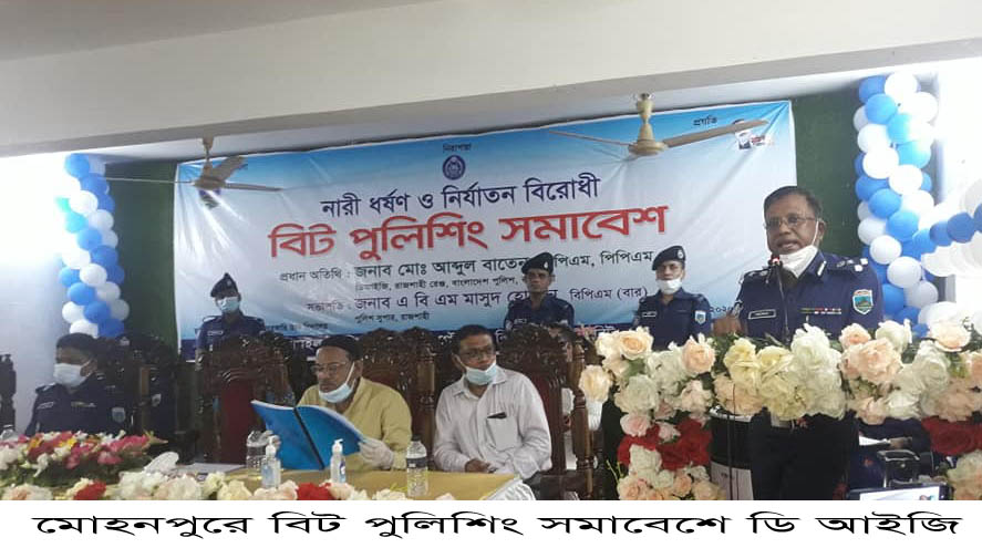 মোহনপুর (রাজশাহী) প্রতিনিধি: রাজশাহীর মোহনপুর উপজেলার বাকশিমইল ইউনিয়ন পরিষদ,কেশরহাট পৌরসভা বিট পুলিশের এর আয়োজনে নারী ধর্ষণ ও নির্যাতন বিরোধী সমাবেশ অনুষ্ঠিত হয়েছে। শনিবার বেলা ১১ টায় মোহনপুর সরকারি উচ্চ বিদ্যালয় হলরুমে এ সমাবেশ অনুষ্ঠিত হয়।রাজশাহী জেলা পুলিশ সুপার এ বিএম মাসুদ হোসেনের বিপিএম (বার) সভাপতিত্বে প্রধান অতিথি ছিলেন রাজশাহী রেঞ্জ এর ডি আইজি আব্দুল বাতেন বিপিএম, পিপিএম তিনি তাঁর বক্তব্যে বলেছেন পুলিশ ও মানুষের সম্পর্ক সুদৃঢ় করতেই বিট পুলিশিং কার্যক্রম চালু করা হয়েছে।