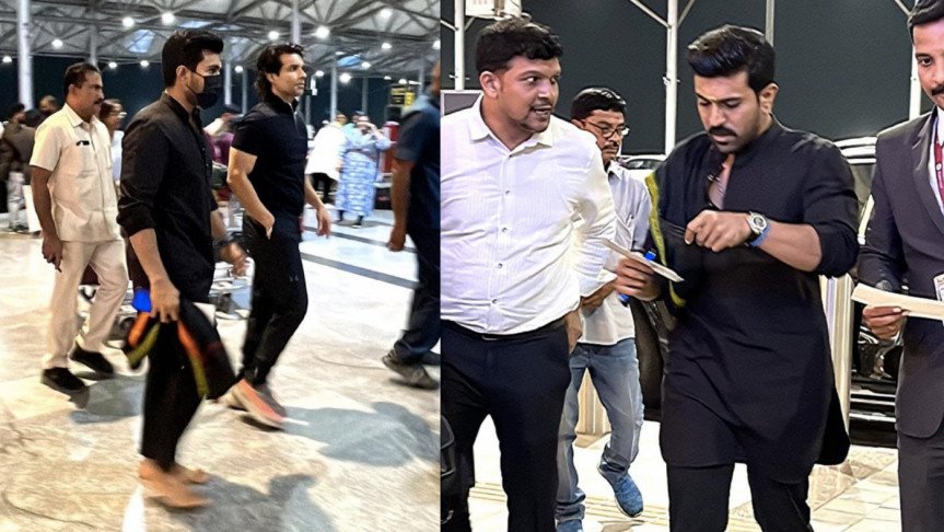 হায়দরাবাদ বিমানবন্দরে খালি পায়ে, কালো পোশাক পরে হেঁটে যাচ্ছেন দক্ষিণ ভারতীয় সুপারস্টার রাম চরণ। হাতে টিকিট আর কাগজপত্র, মুখে কালো মাস্ক।