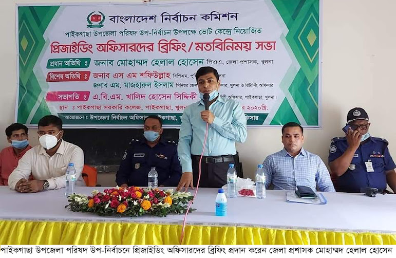 ইমদাদুল হক,পাইকগাছা,খুলনা: খুলনা জেলা প্রশাসক মোহাম্মদ হেলাল হোসেন বলেছেন, পাইকগাছা উপজেলা পরিষদ উপ-নির্বাচন অবাধ, সুষ্ঠু ও নিরপেক্ষ করতে প্রশাসন ও নির্বাচন কমিশনের পক্ষ থেকে সবধরণের প্রস্তুতি গ্রহণ করা হয়েছে। নির্বাচনে আইন শৃংখলা বাহিনী নিয়োজিত থাকবে। কেউ নির্বাচনের পরিবেশ বিনষ্ট করার চেষ্টা করলে তাদের কাউকে ছাড় দেওয়া হবে না। ভোটাররা নির্ভয়ে এবং নিবিঘেœ ভোট দিতে পারবেন উল্লেখ করে ভোট কেন্দ্রের নির্বাচনী অনুকূল পরিবেশ বজায় রাখার জন্য নির্বাচনে দায়িত্বরত কর্মকর্তাদের বিভিন্ন দিক নির্দেশনা প্রদান করেন।