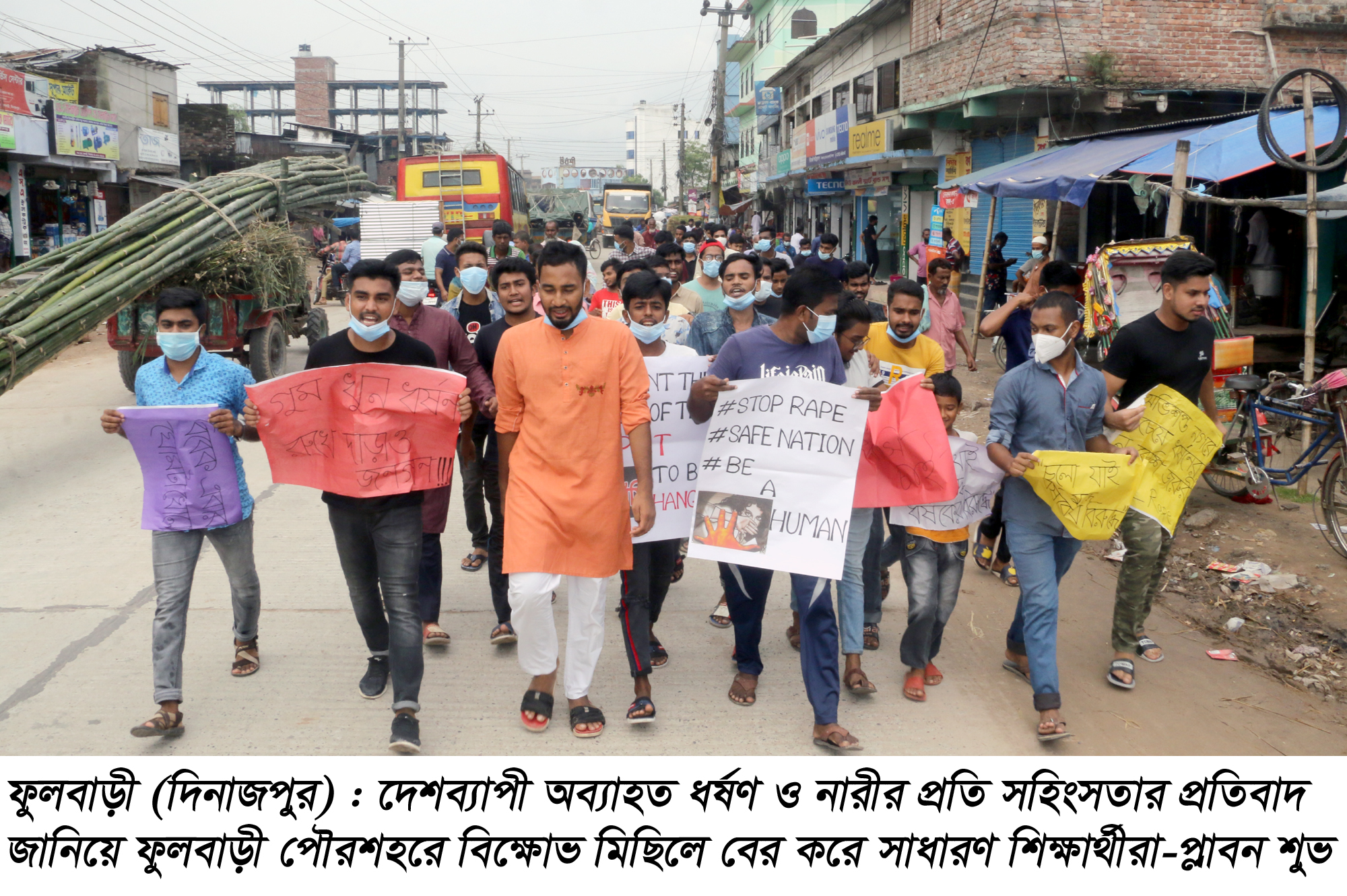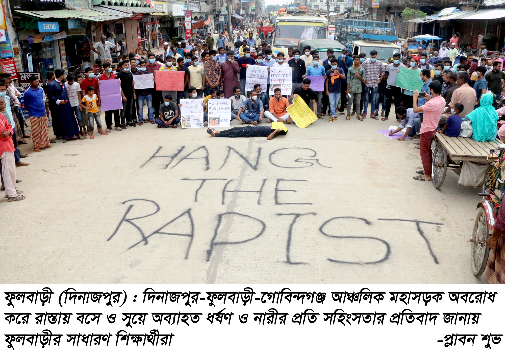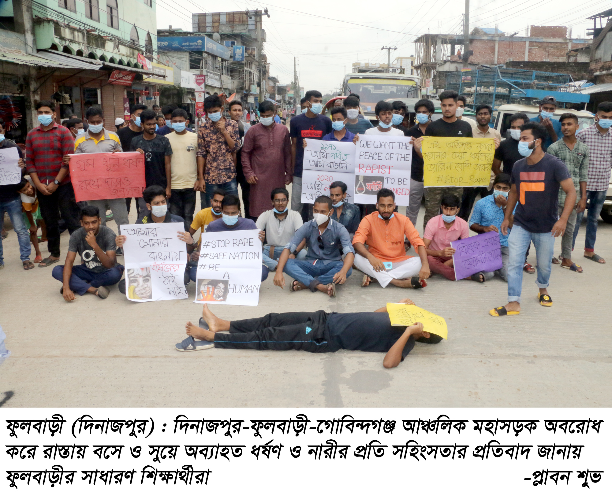 পরে দিনাজপুর-ফুলবাড়ী-ঢাকা আ লিক মহাসড়ক অবরোধ করে রাস্তায় বসে ও সুয়ে অব্যাহত ধর্ষণ ও নারীর প্রতি সহিংসতার প্রতিবাদ জানায় শতাধিক শিক্ষার্থী।