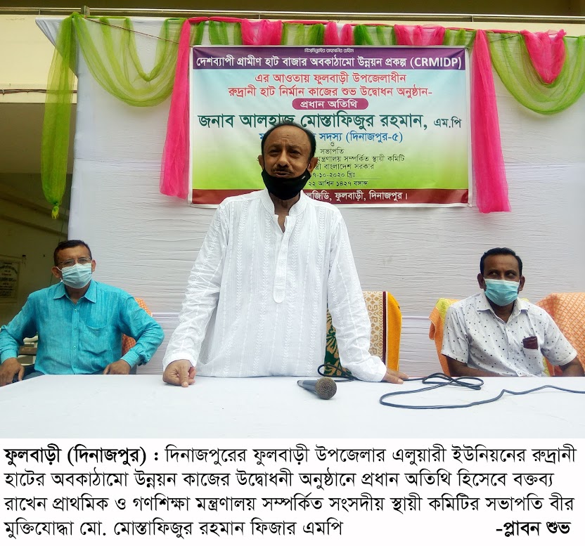 প্লাবন শুভ, ফুলবাড়ী (দিনাজপুর) প্রতিনিধি : দিনাজপুরের ফুলবাড়ী উপজেলার এলুয়ারী ইউনিয়নের রুদ্রানী হাটের অকাঠামো নির্মাণ কাজের উদ্বোধন করা হয়েছে। গতকাল বুধবার সকাল সাড়ে ১০ টায় নির্মাণ কাজের উদ্বোধন করেন প্রাথমিক ও গণশিক্ষা মন্ত্রণালয় সম্পর্কিত সংসদীয় স্থায়ী কমিটির সভাপতি বীর মুক্তিযোদ্ধা মো. মোস্তাফিজুর রহমান ফিজার এমপি।