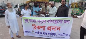 আব্দুল মজিদ, নাটোর সংবাদদাতা : নাটোরে সমাজের অসহায় ও দুঃস্থ মানুষের পাশে দাঁড়িয়ে মানবিক দৃষ্টান্ত স্থাপন করেছে স্বেচ্ছাসেবী সংগঠন ‘লাইফ ফর লাইফ’। কর্মসংস্থানের সুযোগ সৃষ্টির লক্ষ্যে সংগঠনটি এক অসহায় পরিবারের হাতে অটোরিকশা হস্তান্তর করেছে।