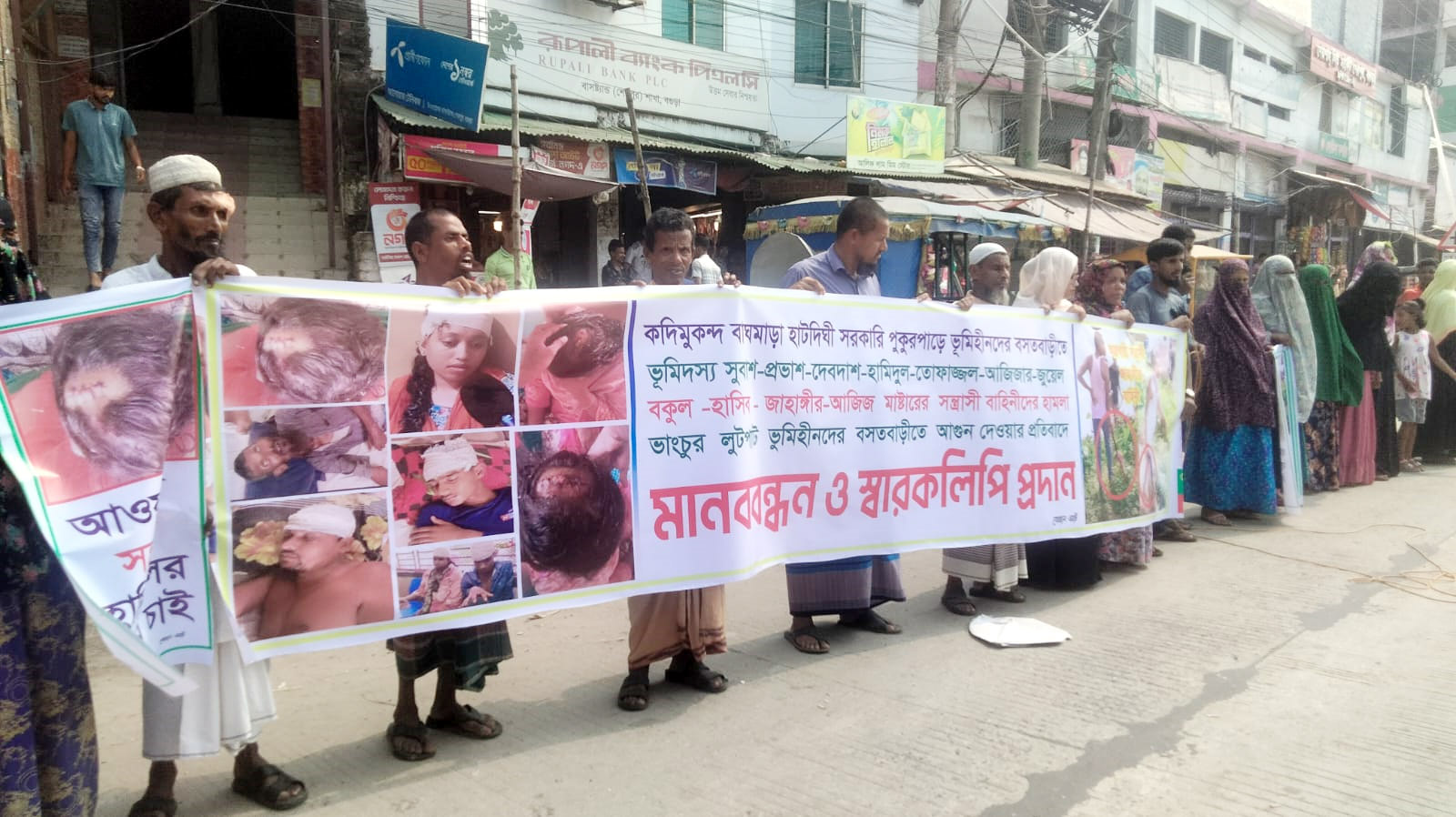 বগুড়ায় ভূমিহীন পরিবারের উপর হামলা মামলা , অগ্নিসংযোগ ও উচ্ছেদের চেষ্টার প্রতিবাদে মানববন্ধন