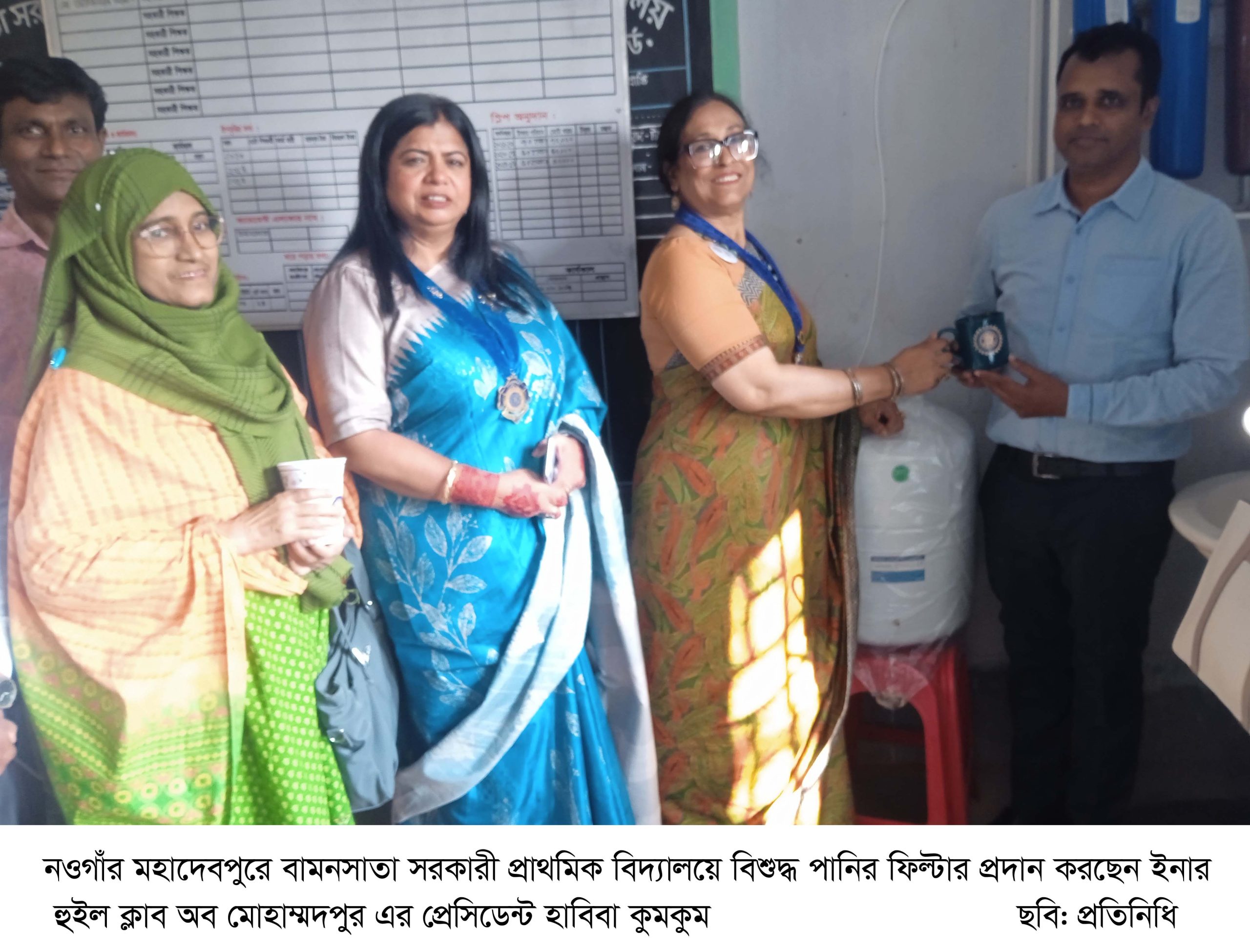 মহাদেবপুর (নওগাঁ) প্রতিনিধি: মানবতার সেবায় নিয়োজিত স্বেচ্ছাসেবী সংগঠন ইনার হুইল ক্লাব অব মোহাম্মদপুর এর উদ্যোগে এবং ডিষ্টিক ৩২৮ বাংলাদেশ এর সহযোগিতায় নওগাঁর মহাদেবপুরে শিক্ষার্থীদের জন্য বিশুদ্ধ পানির ফিল্টার প্রদান করা হয়েছে। রবিবার বিকালে ইনার হুইল ক্লাব অব মোহাম্মদপুর এর প্রেসিডেন্ট হাবিবা কুলসুম উপজেলার বামনসাতা সরকারী প্রাথমিক বিদ্যালয়ে এ বিশুদ্ধ পানির ফিল্টার প্রদান করেন। এ সময় তাঁর সাথে ইনার হুইল ক্লাব অব মোহাম্মদপুর এর সেক্রেটারী লিপি ইকবাল ও ইনার ক্লাব অব ভুবনডাঙ্গা এর প্রেসিডেন্ট নাসিমা আলম উপস্থিত ছিলেন। এর আগে বিদ্যালয়ের হলরুমে বিশুদ্ধ পানি ও স্বাস্থ্য সচেতনতা বিষয়ে আলোচনা সভা অনুষ্ঠিত হয়। এতে বক্তব্য রাখেন উপজেলা শিক্ষা অফিসার ইতি আরা, সহকারী শিক্ষা অফিসার রঞ্জন কুমার, প্রধান শিক্ষক আলতাফ হোসেন, মহাদেবপুর প্রেসক্লাবের সভাপতি আজাদুল ইসলাম আজাদ প্রমুখ। অনুষ্ঠানে উপস্থিত শিশুদের মাঝে ইনার হুইল ক্লাব অব মোহাম্মদপুর এর প্রেসিডেন্ট হাবিবা কুলসুম শিশুতোষ বই উপহার দেন।