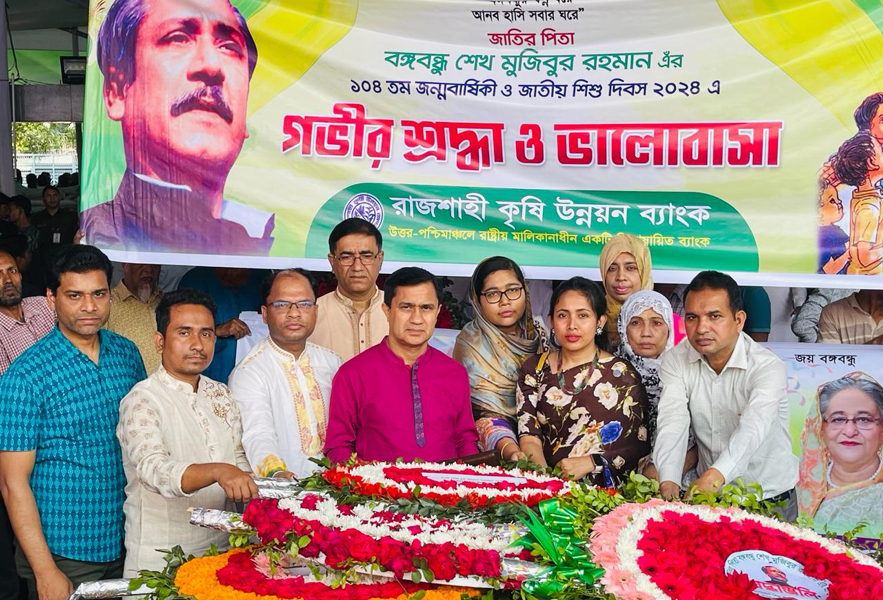 প্রেস বিজ্ঞপ্তি: জাতির পিতা বঙ্গবন্ধু শেখ মুজিবুর রহমান-এর ১০৪তম জন্মবার্ষিকী ও জাতীয় শিশু দিবস উদযাপন উপলক্ষে রাজশাহী কৃষি উন্নয়ন ব্যাংক (রাকাব) এর পক্ষ থেকে ধানমন্ডি ৩২ এ অবস্থিত জাতীর পিতা বঙ্গবন্ধু শেখ মুজিবুর রহমান এর প্রতিকৃতিতে পুস্পস্তবক অর্পণের মাধ্যমে শ্রদ্ধা নিবেদন করেন ব্যাংকের ব্যবস্থাপনা পরিচালক নিরঞ্জন চন্দ্র দেবনাথ।