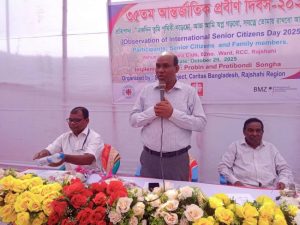 রাইন মোস্তাফী নিশাতঃ রাজশাহীতে ‘একদিন তুমি পৃথিবী গড়েছো, আজ আমি স্বপ্ন গড়বো, সযত্নে তোমায় রাখবো আগলে’ স্লোগানে ৩৫ তম আন্তর্জাতিক প্রবীণ দিবস উপলক্ষে আলোচনা সভা অনুষ্ঠিত হয়। বুধবার সকাল ১০ টার দিকে রাজশাহী নগরীর মোল্লাপাড়া এলাকায় এসডিডিবি প্রজেক্টের কারিতাস বাংলাদেশ রাজশাহী রিজিওন এই অনুষ্ঠানের আয়োজন করেন।